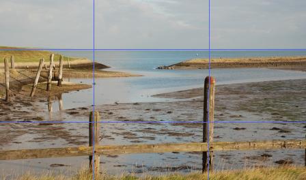 Regel van derden- Over smaak valt niet te twisten, maar er zijn wel degelijk vuistregels die in de fotografie kunnen worden toegepast om een foto interessanter te maken. Zo is er de zogenaamde "Regel van derden", waarbij de foto denkbeeldig in negen vlakken wordt verdeeld. Hierbij wordt de foto zowel horizontaal als verticaal in drieen gedeeld en is dus de kunst om de aandachtspunten op of rond een van de snijvlakken te leggen. Dit noemt men een "sterke plaats". Als aan deze voorwaarde wordt voldaan zal een foto vaak sterker en dynamischer worden en beschouwt men de foto als esthetisch aangenaam. Probeer bij landschapschapsopnamen zoals in het voorbeeld de horizon op (in dit geval) 1/3 van de bovenzijde te leggen wanneer de meeste aandacht uit moet gaan naar de voorgrond. Moet er meer aandacht zijn voor de lucht, probeer de horizon dan op ongeveer 1/3 vanaf de onderzijde te leggen. Deze regel van derden is in feite een vereenvoudigde toepassing van de zogenaamde "Gulden Snede". Zie hieronder 2 voorbeelden.